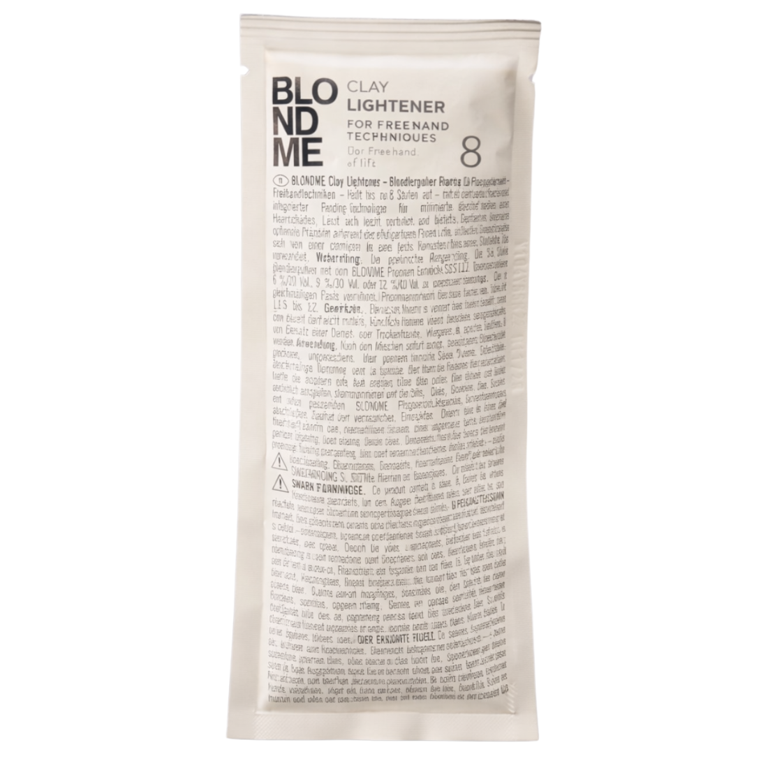 Schwarzkopf Professional BLONDME Clay Lightener 8 is a low-dust lightener designed for creative freehand techniques such as balayage. The clay-based formula with integrated Anti-Metal Bond Protection technology protects the hair structure during the lightening process, reduces breakage, and delivers natural, radiant blonde results with up to 8 levels of lift.