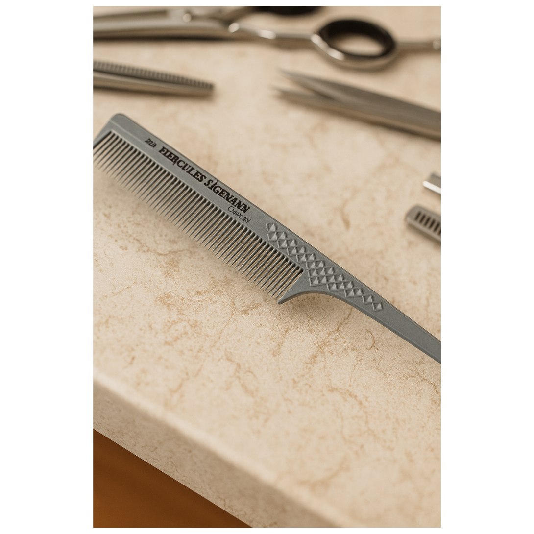 Découvrez le peigne à queue et à crêper de Hercules Sägemann – fabriqué en matériau carbone de haute qualité, conçu pour un séparation précise et un crêpage professionnel. Le peigne professionnel idéal pour les coiffeurs et les utilisateurs exigeants, antistatique, résistant à la chaleur et durable – Made in Germany.