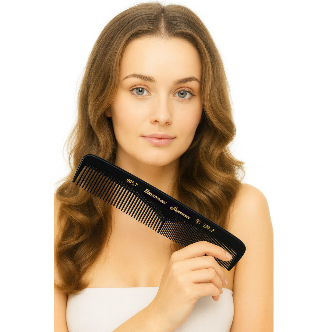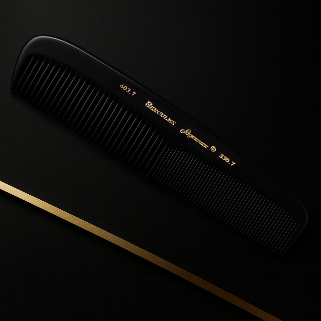 Découvrez la gamme premium de peignes de poche signés Hercules Sägemann : le modèle homme 610-310 (6" / 15,2 cm) et les modèles femme 603-330 (7½" / 19,1 cm), 1676-492 (7" / 18 cm) et 631-445 (7" / 17,8 cm). Chaque peigne est finement travaillé à la main en ébonite durable, offrant une performance antistatique, une glisse fluide et une précision digne du salon dans un format compact et facile à transporter.