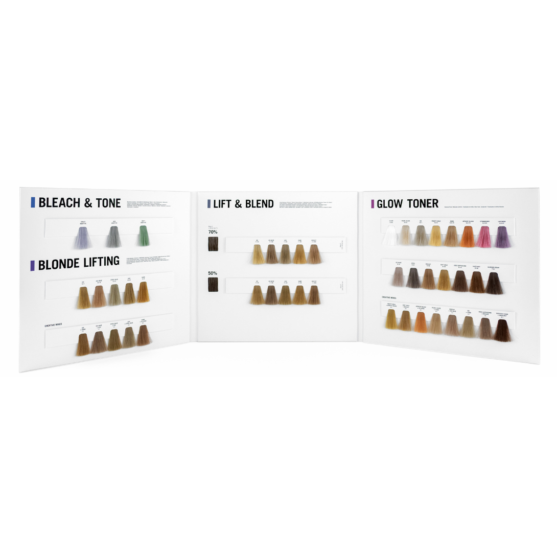 La carte couleur s'ouvre en trois panneaux revelant les principales categories BlondMe : Bleach & Tone, Blonde Lifting, Lift & Blend et Glow Toner. Chaque categorie dispose de meches explicatives permettant de comparer directement le rendu final sur les differentes bases.