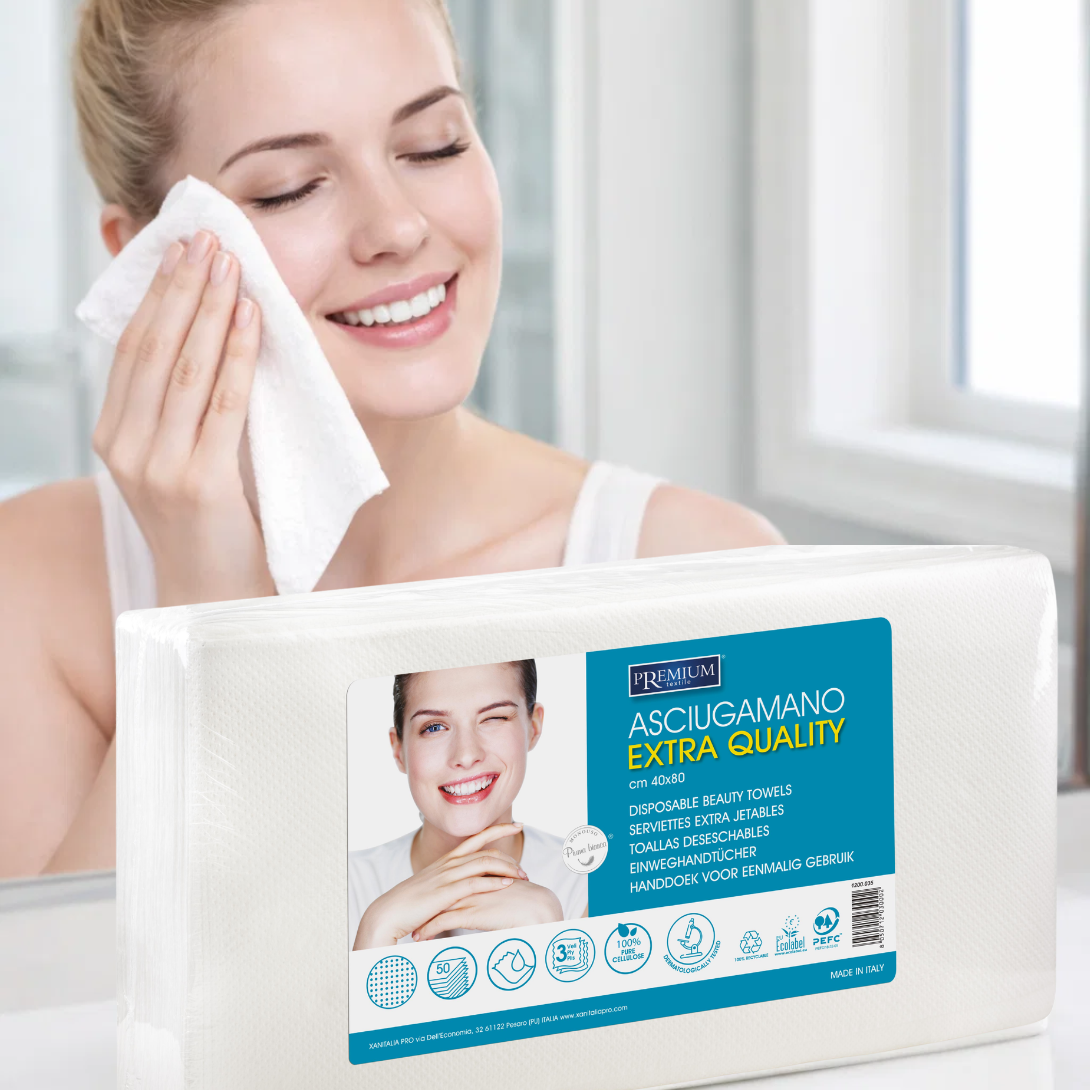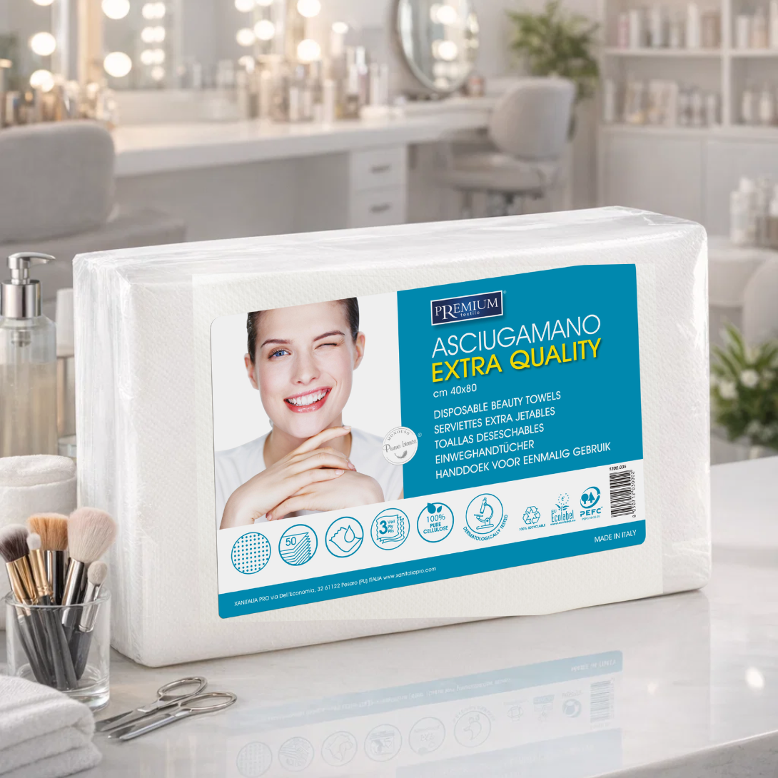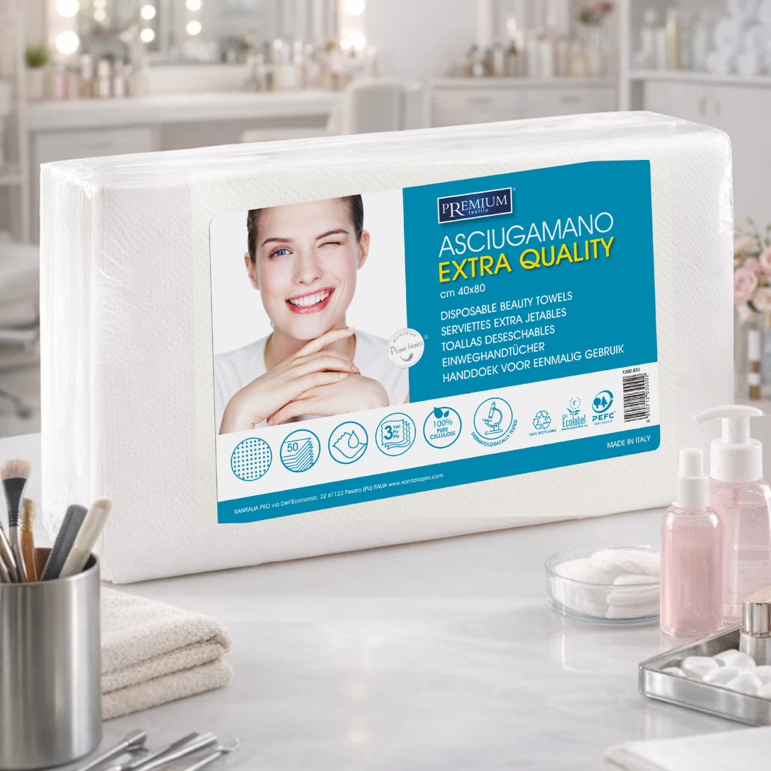 Les serviettes jetables Premium Extra Quality 40 x 80 cm sont des serviettes à usage unique hygiéniques conçues pour une utilisation professionnelle dans les instituts de beauté, les spas, les salons de coiffure, les centres de bien-être, les cabinets et l’activité quotidienne en studio. Chaque paquet contient 50 serviettes en cellulose au format 40 x 80 cm, offrant une solution pratique et propre partout où une serviette fraîche est nécessaire.
