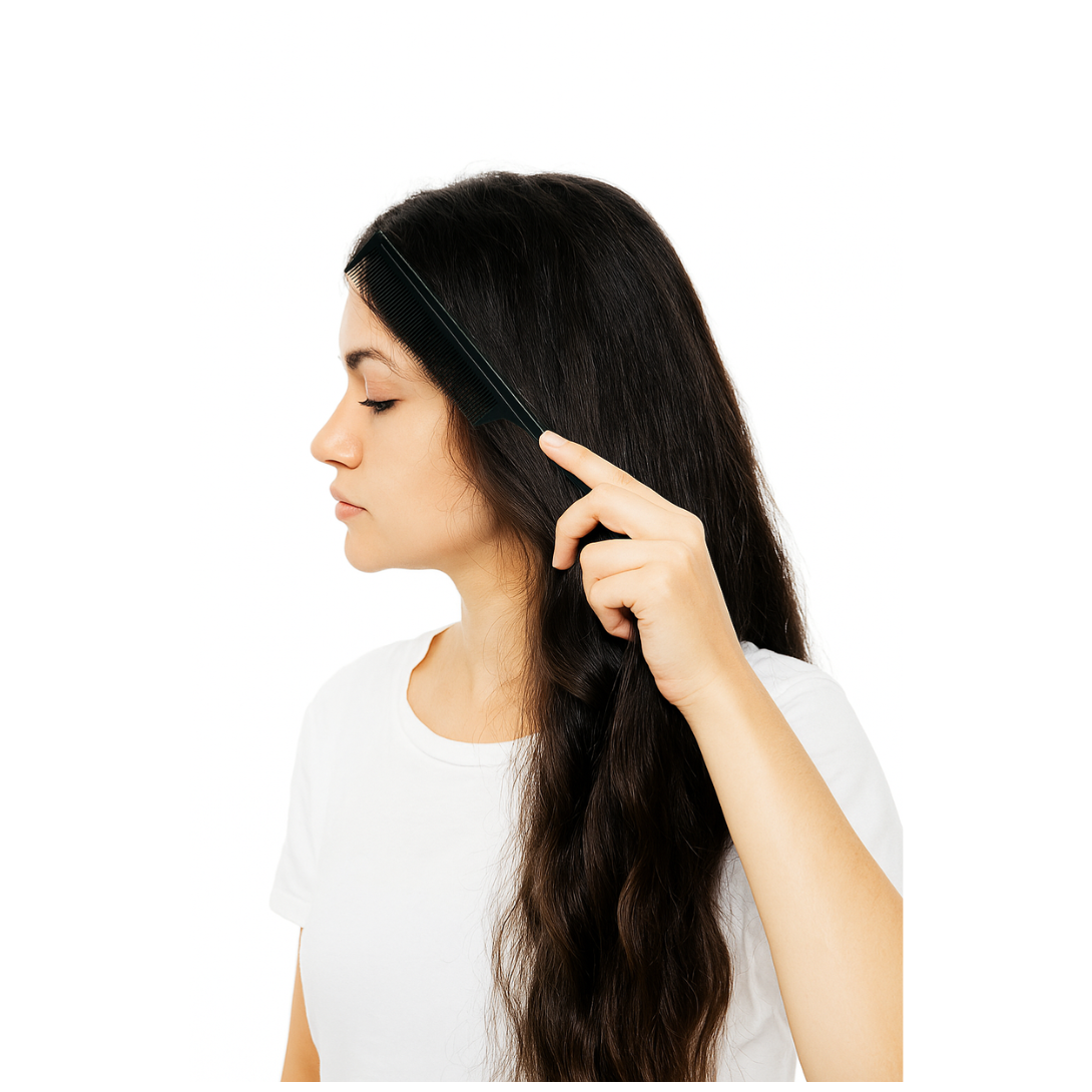Handpolierte Zähne gleiten sanft durchs Haar.
