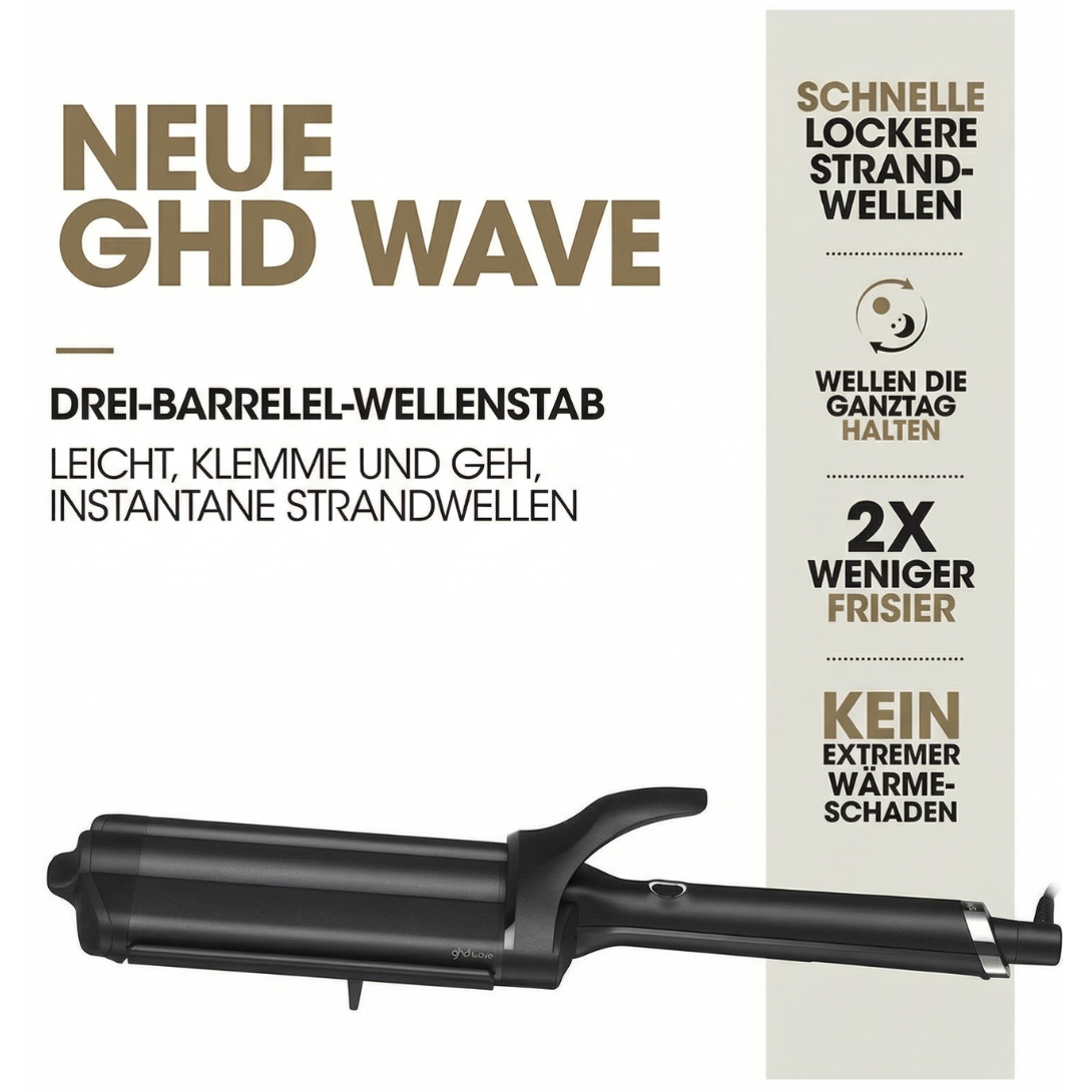 Il ghd Wave Triple Barrel ferro ondulante è lo strumento ideale per creare Beach Waves moderne e onde ampie, regolari e a lunga durata. Grazie alla tecnologia avanzata ghd Heat Technology con sensori integrati, mantiene una temperatura di styling ottimale e costante per un risultato uniforme, luminoso e rispettoso della fibra capillare. Perfetto per un look naturale e texturizzato, a casa o in salone.