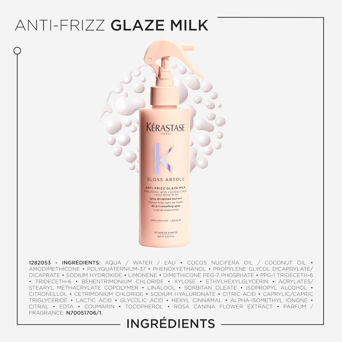 Das Kérastase Gloss Absolu Anti-Frizz Glaze Milk ist ein leichtes Leave-in-Spray, das Frizz bändigt, intensiv hydratisiert und das Haar bis zu 230 °C vor Hitze schützt. Mit Hyaluronsäure, Glykolsäure und Wildrosenöl angereichert, verleiht es Glanz, Geschmeidigkeit und professionelle Disziplin für jedes Styling.